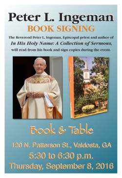 Valdosta’s newest bookstore, Book & Table at 120 North Patterson Street, hosted a book signing from 5:30 – 6:30 p.m. on September 8, 2016, for Fr. Peter Ingeman’s book, In His Holy Name: A Collection of Sermons. Approximately sixty people attended this event. The bookstore had hardbound and paperbound books available for purchase, and Fr. Ingeman autographed books during the event. The bookstore owners, Mike and Lai Orenduff, donated the profits from this event to Christ Church’s altar guild.